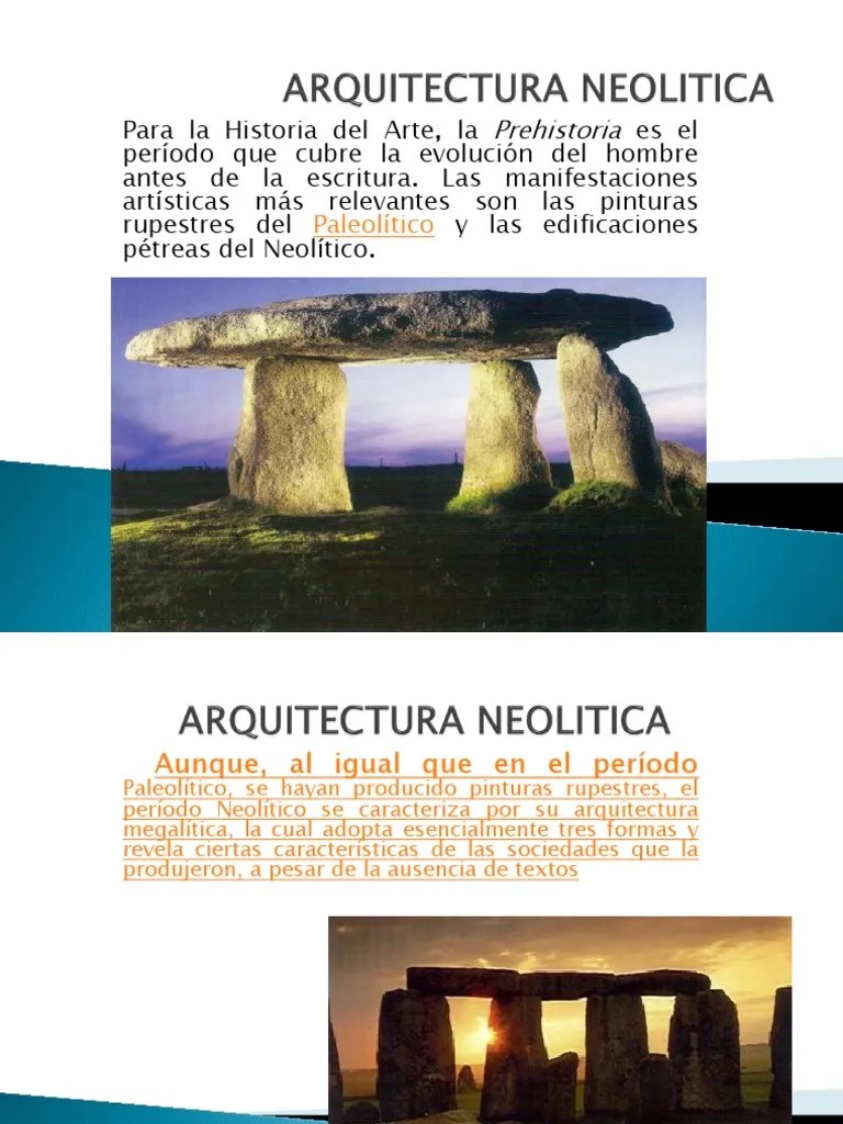 Oct 12, 2019 · arquitectura neolítica. May 29, 2020 · la arquitectura megalítica.. Se denomina arquitectura neolítica a los primeros hitos conservados de la arquitectura.